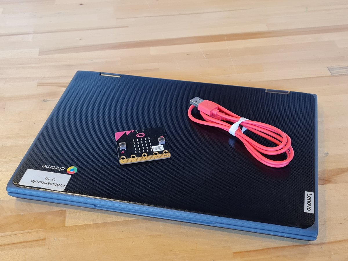 Chromebook tölvur með snertiskjá henta hér sérstaklega vel þar sem það er svo auðvelt að færa púslin til með höndunum, en ef unnið er á hefðbundna fartölvu er gott að vera með mús í stað snertiflatarins. - USB kapal með Micro-USB tengi (sem passar í Microbit tölvuna)