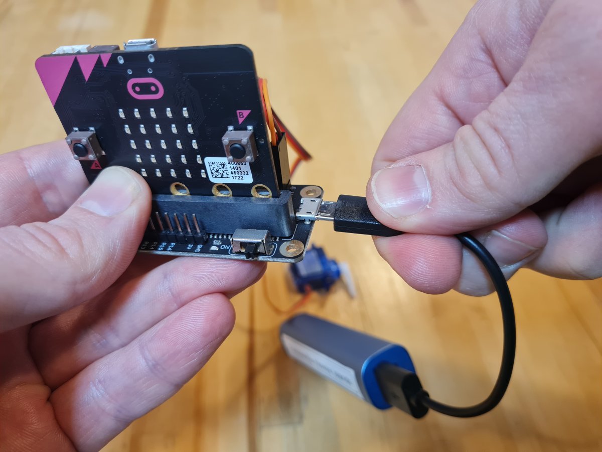 Þetta getur verið t.a.m. orkubanki en þú getur einnig notað micro-USB tengið sem þú notaðir til að forrita micro:bit-ann, tekið það úr sambandi við micro:bit tölvuna og stungið í samsvarandi tengi á servo:bit brettinu.